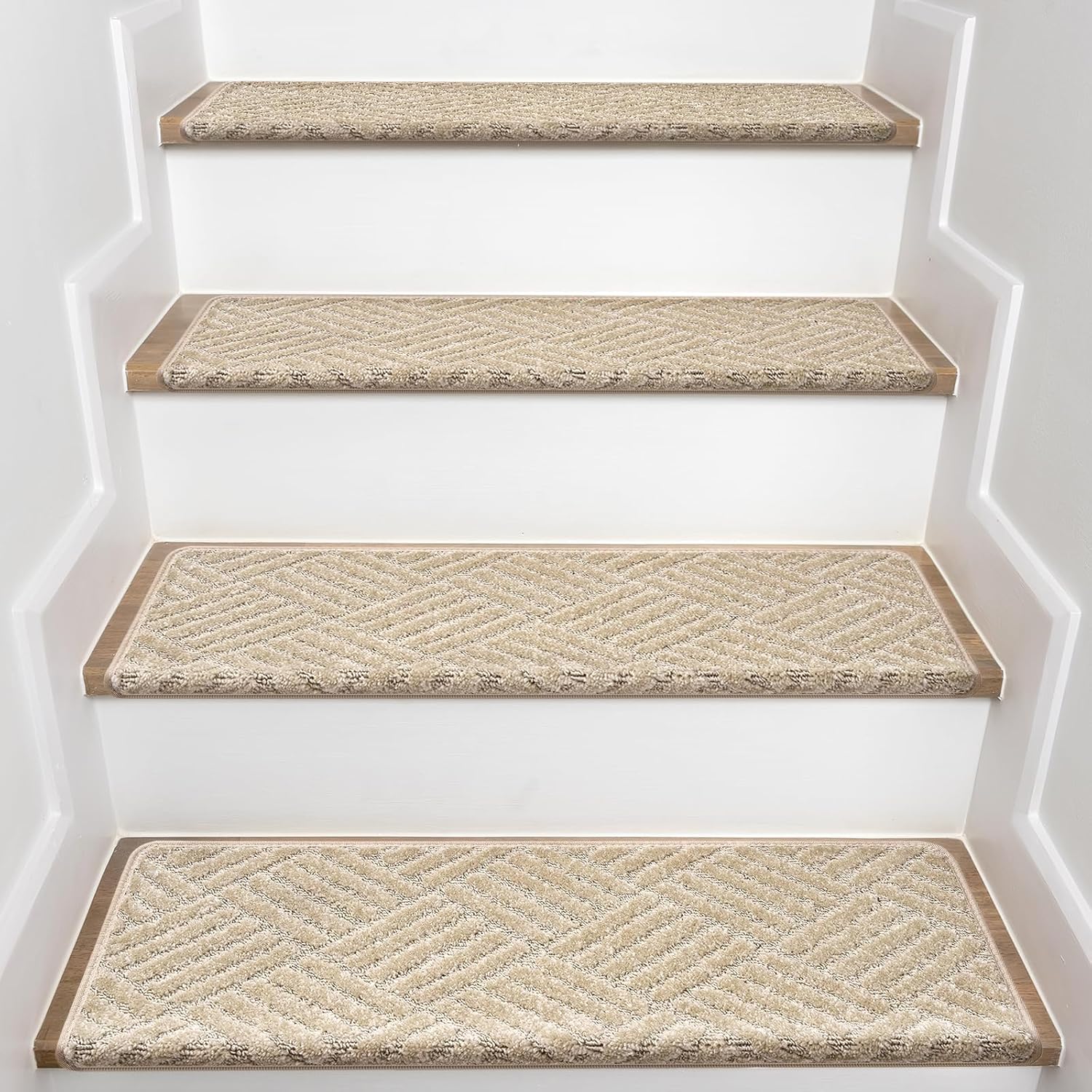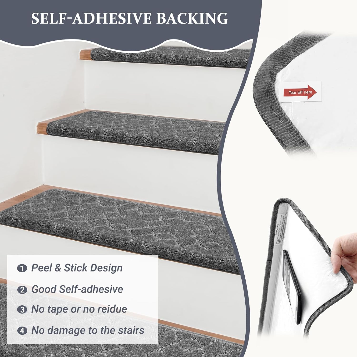 Bullnose Carpet Stair Treads, Stairs Carpet Non Slip 15 Pack, Stair Step Rugs 30"x9.5"x1.2", Soft, Reusable, Peel and Stick Stair Treads for Wooden Steps Indoor (Grey, Diamond Pattern)