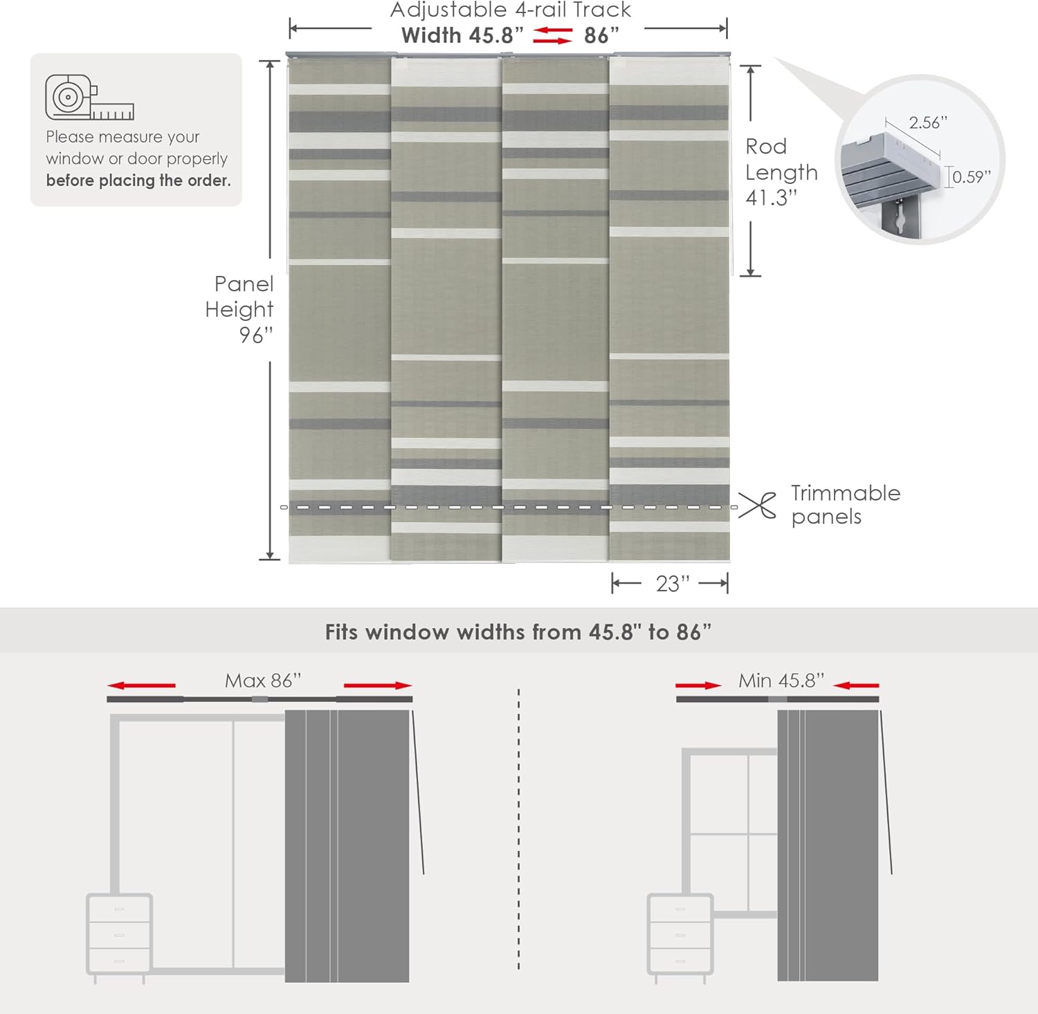 The 4-rail track is adjustable anywhere from 45.8" to 86" wide that can be used for large windows, sliding doors, or as a room divider.